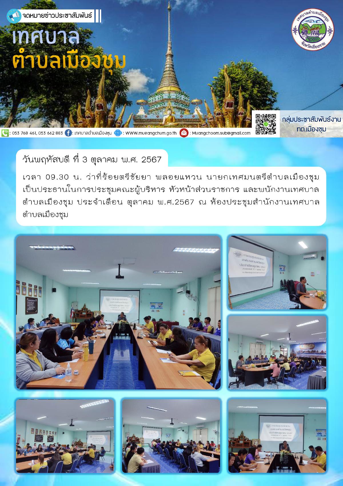 วันพฤหัสบดี ที่ 3 ตุลาคม พ.ศ. 2567 เวลา 09.30 น. ว่าที่ร้อยตรีชัยยา พลอยแหวน นายกเทศมนตรีตำบลเมืองชุม เป็นประธานในการประชุมคณะผู้บริหาร หัวหน้าส่วนราชการ และพนักงานเทศบาลตำบลเมืองชุม ประจำเดือน ตุลาคม พ.ศ.2567 ณ ห้องประชุมสำนักงานเทศบาลตำบลเมืองชุม