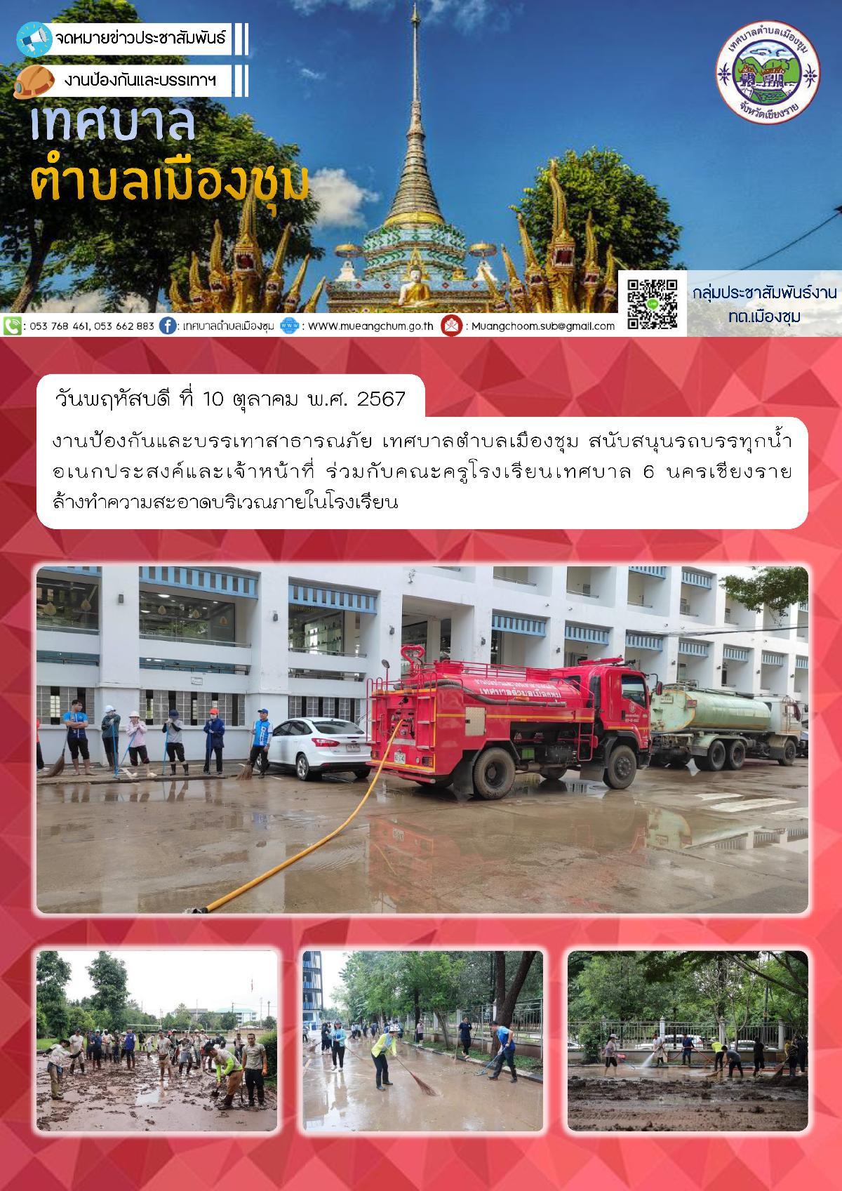 วันพฤหัสบดี ที่ 10 ตุลาคม พ.ศ. 2567 งานป้องกันและบรรเทาสาธารณภัย เทศบาลตำบลเมืองชุม สนับสนุนรถบรรทุกน้ำอเนกประสงค์และเจ้าหน้าที่ ร่วมกับคณะครูโรงเรียนเทศบาล 6 นครเชียงราย ล้างทำความสะอาดบริเวณภายในโรงเรียน