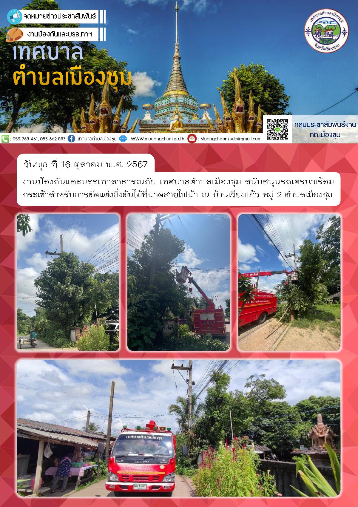 วันพุธ ที่ 16 ตุลาคม พ.ศ. 2567 งานป้องกันและบรรเทาสาธารณภัย เทศบาลตำบลเมืองชุม สนับสนุนรถเครนพร้อมกระเช้าสำหรับการตัดแต่งกิ่งต้นไม้ที่พาดสายไฟฟ้า ณ บ้านเวียงแก้ว หมู่ 2 ตำบลเมืองชุม