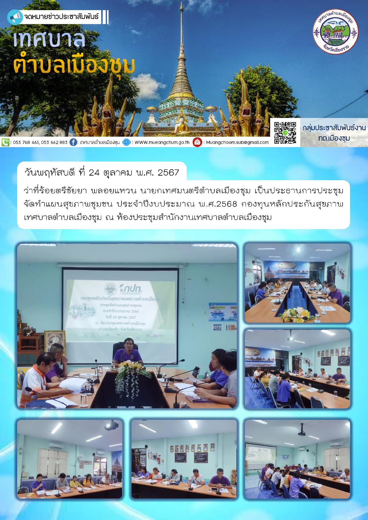 วันพฤหัสบดี ที่ 24 ตุลาคม พ.ศ. 2567 ว่าที่ร้อยตรีชัยยา พลอยแหวน นายกเทศมนตรีตำบลเมืองชุม เป็นประธานการประชุมจัดทำแผนสุขภาพชุมชน ประจำปีงบประมาณ พ.ศ.2568 กองทุนหลักประกันสุขภาพเทศบาลตำบลเมืองชุม ณ ห้องประชุมสำนักงานเทศบาลตำบลเมืองชุม