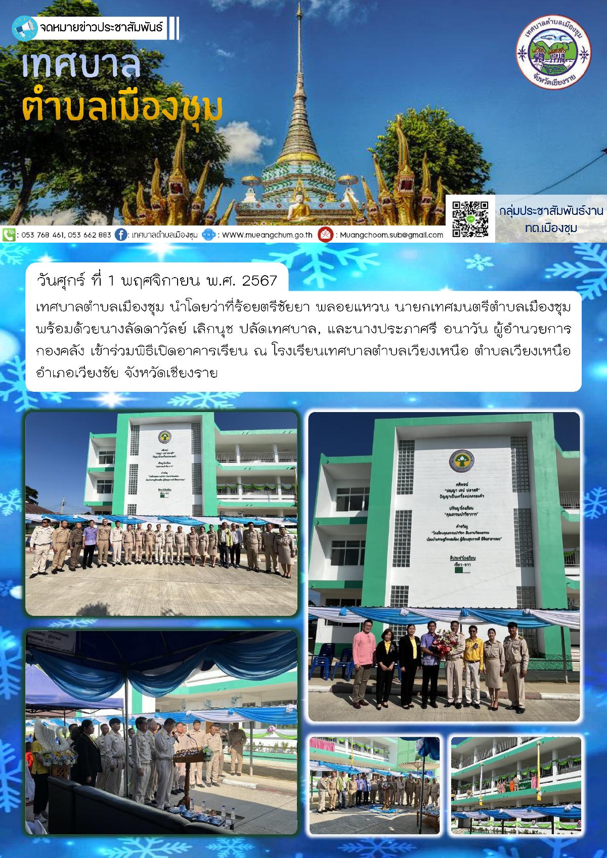 วันศุกร์ ที่ 1 พฤศจิกายน พ.ศ. 2567 เทศบาลตำบลเมืองชุม นำโดยว่าที่ร้อยตรีชัยยา พลอยแหวน นายกเทศมนตรีตำบลเมืองชุม พร้อมด้วยนางลัดดาวัลย์ เลิกนุช ปลัดเทศบาล, และนางประภาศรี อนาวัน ผู้อำนวยการกองคลัง เข้าร่วมพิธีเปิดอาคารเรียน ณ โรงเรียนเทศบาลตำบลเวียงเหนือ ตำบลเวียงเหนือ อำเภอเวียงชัย จังหวัดเชียงราย