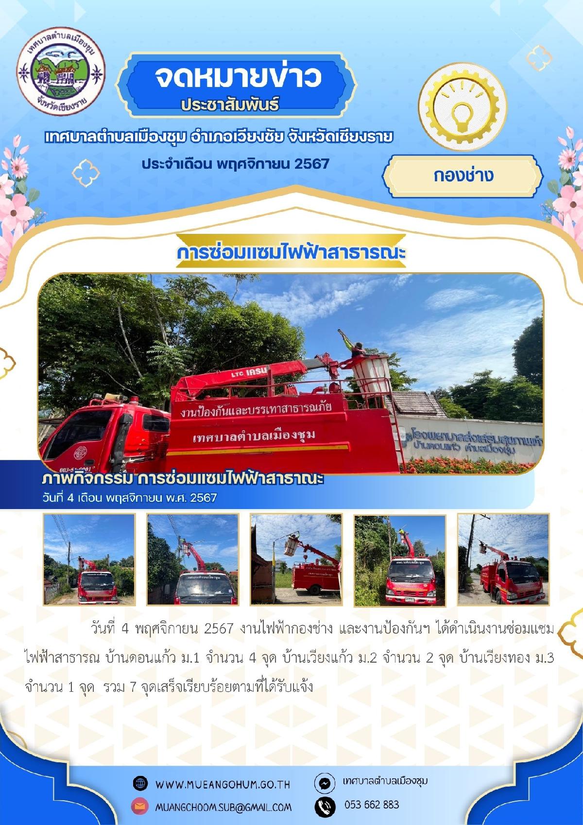 วันที่ 4 พฤศจิกายน 2567 งานไฟฟ้ากองช่าง และงานป้องกันฯ ได้ดำเนินการซ่อมแซมไฟฟ้าสาธารณะ (ไฟกิ่ง) บ้านดอนแก้ว ม.1 จำนวน 4 จุด บ้านเวียงแก้ว ม.2 จำนวน 2 จุด บ้านเวียงทอง ม.3 จำนวน 1 จุด รวมทั้งหมด 7 จุด เสร็จเรียบร้อยตามที่ได้รับแจ้ง
