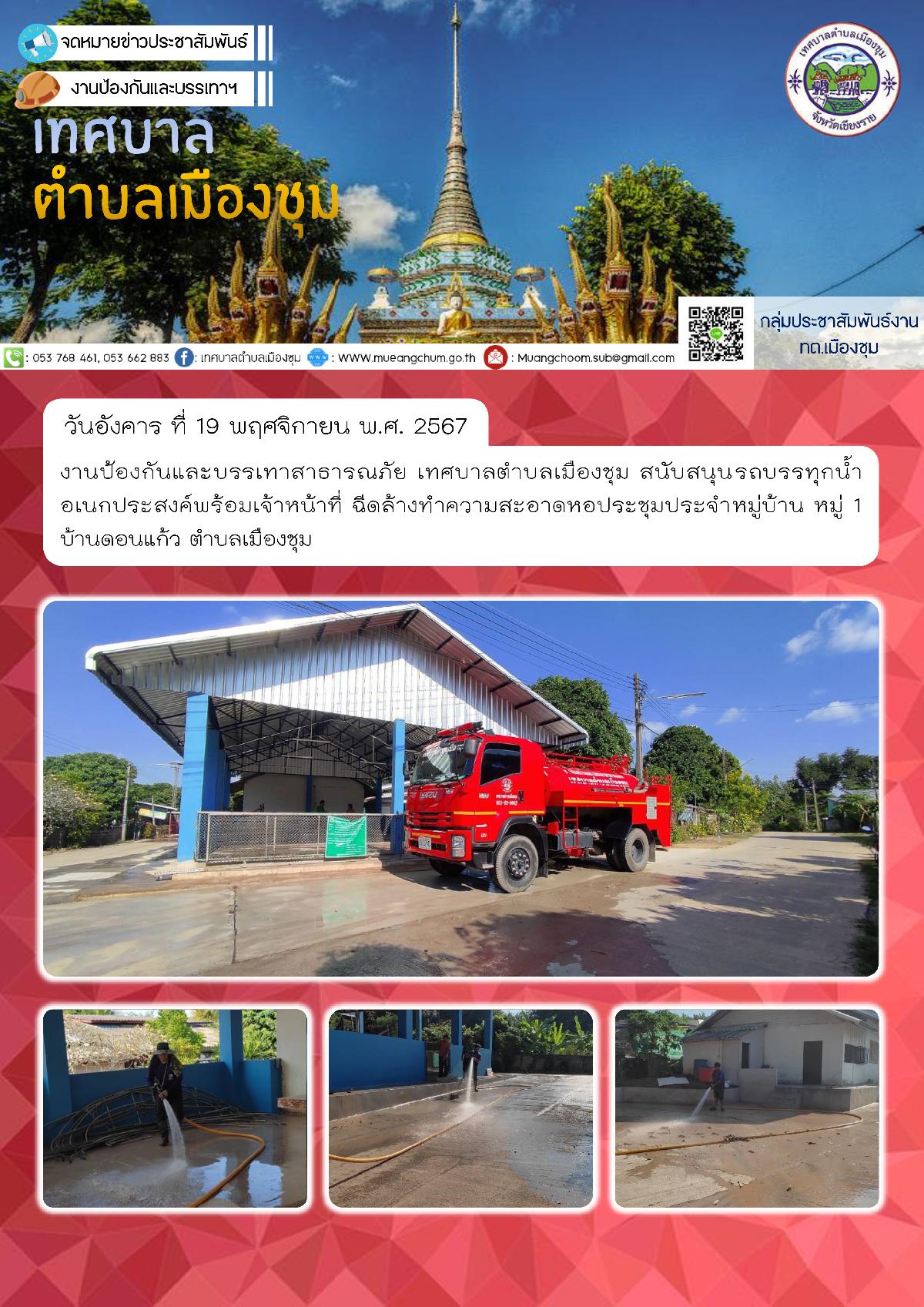 วันอังคาร ที่ 19 พฤศจิกายน พ.ศ. 2567 งานป้องกันและบรรเทาสาธารณภัย เทศบาลตำบลเมืองชุม สนับสนุนรถบรรทุกน้ำอเนกประสงค์พร้อมเจ้าหน้าที่ ฉีดล้างทำความสะอาดหอประชุมประจำหมู่บ้าน หมู่ 1 บ้านดอนแก้ว ตำบลเมืองชุม