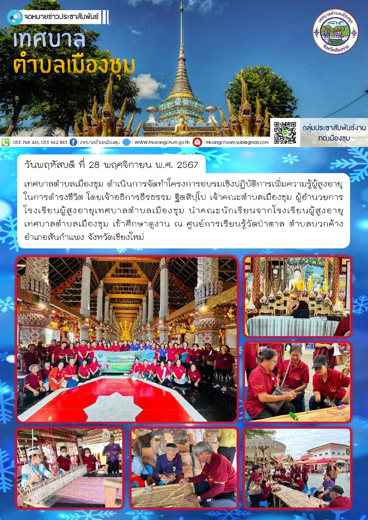 วันพฤหัสบดี ที่ 28 พฤศจิกายน พ.ศ. 2567 เทศบาลตำบลเมืองชุม ดำเนินการจัดทำโครงการอบรมเชิงปฏิบัติการเพิ่มความรู้ผู้สูงอายุในการดำรงชีวิต โดยเจ้าอธิการธีรธรรม ฐิตสิปฺโป เจ้าคณะตำบลเมืองชุม ผู้อำนวยการโรงเรียนผู้สูงอายุเทศบาลตำบลเมืองชุม นำคณะนักเรียนจากโรงเรียนผู้สูงอายุเทศบาลตำบลเมืองชุม เข้าศึกษาดูงาน ณ ศูนย์การเรียนรู้วัดป่าตาล ตำบลบวกค้าง อำเภอสันกำแพง จังหวัดเชียงใหม่