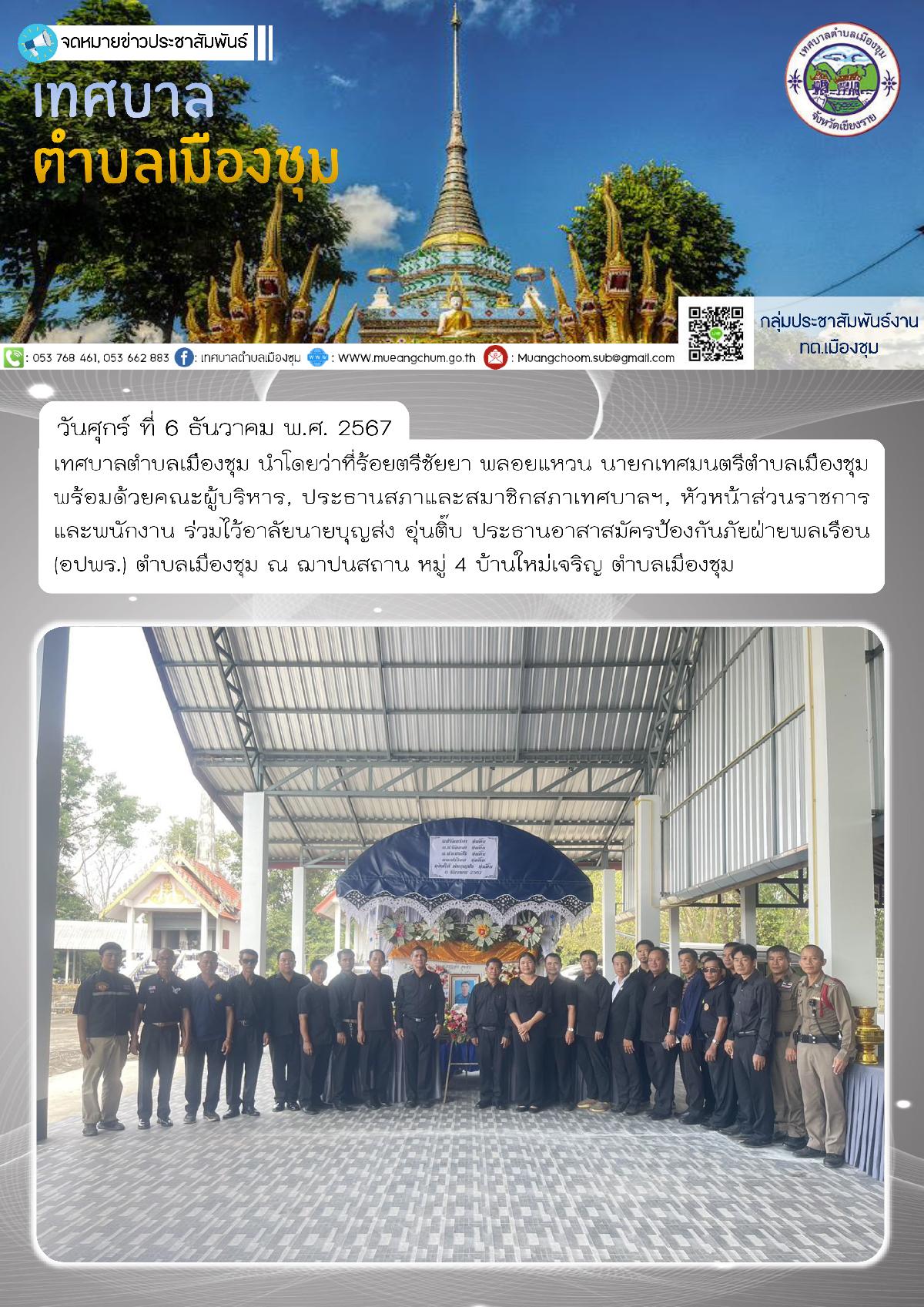 วันศุกร์ ที่ 6 ธันวาคม พ.ศ. 2567 เทศบาลตำบลเมืองชุม นำโดยว่าที่ร้อยตรีชัยยา พลอยแหวน นายกเทศมนตรีตำบลเมืองชุม พร้อมด้วยคณะผู้บริหาร, ประธานสภาและสมาชิกสภาเทศบาลฯ, หัวหน้าส่วนราชการ และพนักงาน ร่วมไว้อาลัยนายบุญส่ง อุ่นติ๊บ ประธานอาสาสมัครป้องกันภัยฝ่ายพลเรือน (อปพร.) ตำบลเมืองชุม ณ ฌาปนสถาน หมู่ 4 บ้านใหม่เจริญ ตำบลเมืองชุม