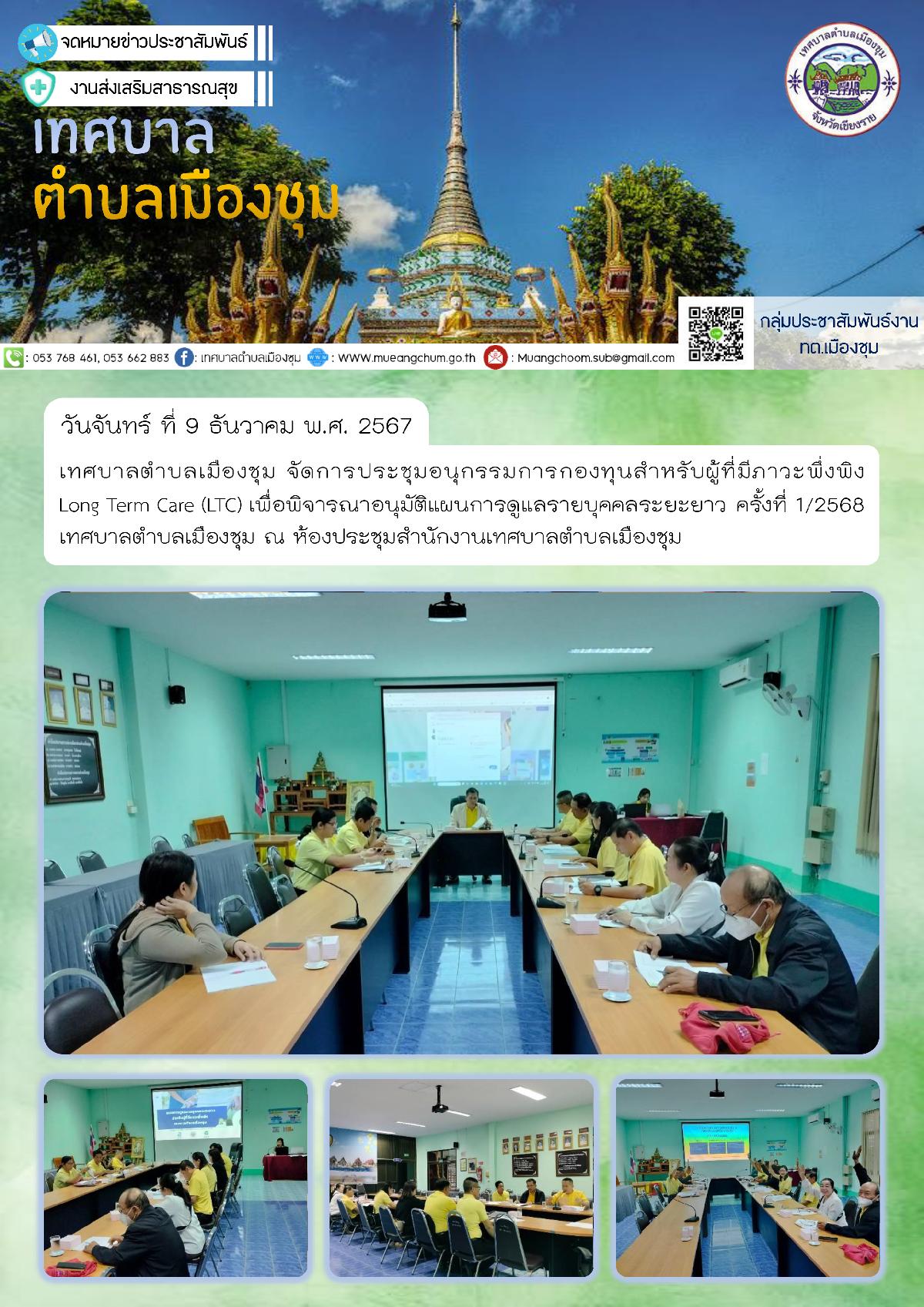 วันจันทร์ ที่ 9 ธันวาคม พ.ศ. 2567 เทศบาลตำบลเมืองชุม จัดการประชุมอนุกรรมการกองทุนสำหรับผู้ที่มีภาวะพึ่งพิง Long Term Care (LTC) เพื่อพิจารณาอนุมัติแผนการดูแลรายบุคคลระยะยาว ครั้งที่ 1/2568 เทศบาลตำบลเมืองชุม ณ ห้องประชุมสำนักงานเทศบาลตำบลเมืองชุม