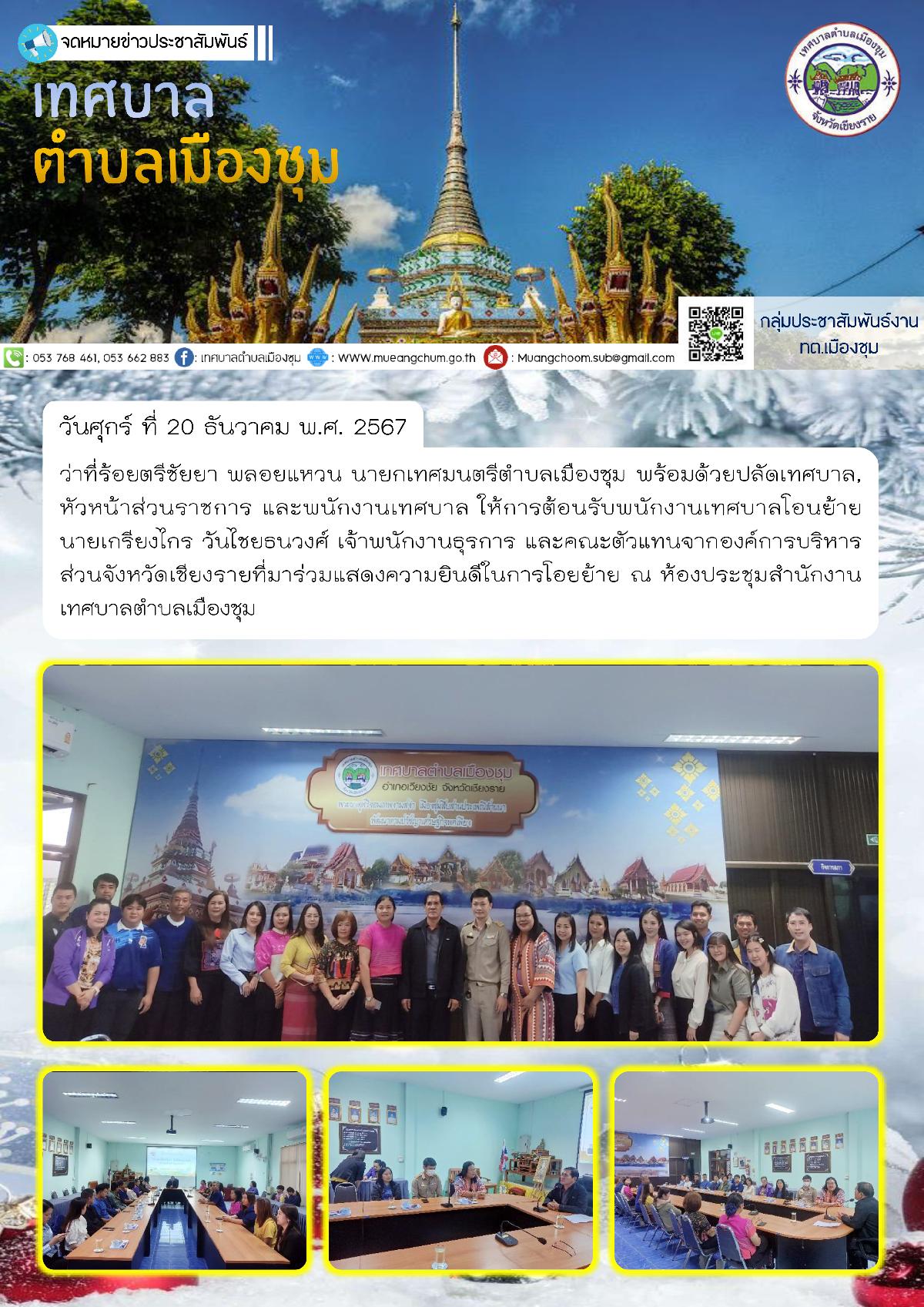วันศุกร์ ที่ 20 ธันวาคม พ.ศ. 2567 ว่าที่ร้อยตรีชัยยา พลอยแหวน นายกเทศมนตรีตำบลเมืองชุม พร้อมด้วยปลัดเทศบาล, หัวหน้าส่วนราชการ และพนักงานเทศบาล ให้การต้อนรับพนักงานเทศบาลโอนย้าย นายเกรียงไกร วันไชยธนวงศ์ เจ้าพนักงานธุรการ และคณะตัวแทนจากองค์การบริหารส่วนจังหวัดเชียงรายที่มาร่วมแสดงความยินดีในการโอยย้าย ณ ห้องประชุมสำนักงานเทศบาลตำบลเมืองชุม