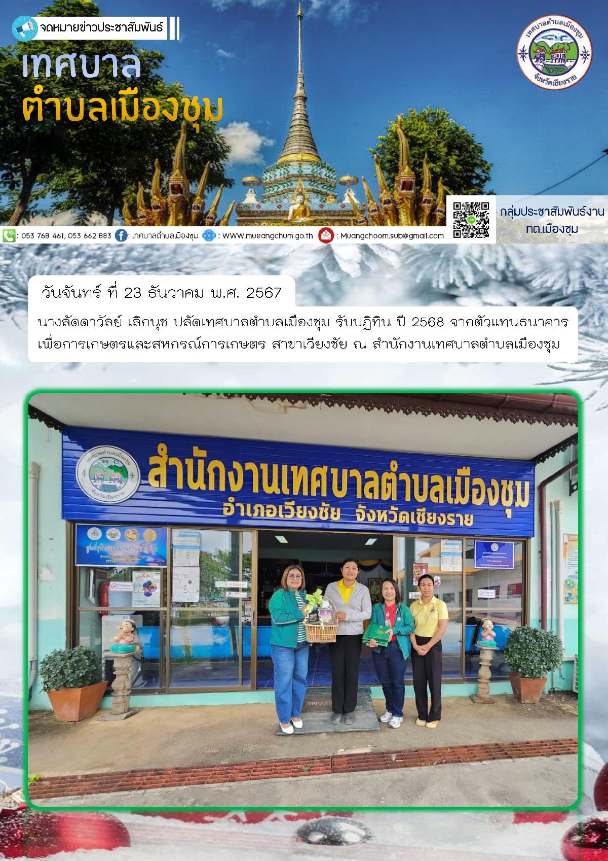 วันจันทร์ ที่ 23 ธันวาคม พ.ศ. 2567 นางลัดดาวัลย์ เลิกนุช ปลัดเทศบาลตำบลเมืองชุม รับปฏิทิน ปี 2568 จากตัวแทนธนาคารเพื่อการเกษตรและสหกรณ์การเกษตร สาขาเวียงชัย ณ สำนักงานเทศบาลตำบลเมืองชุม