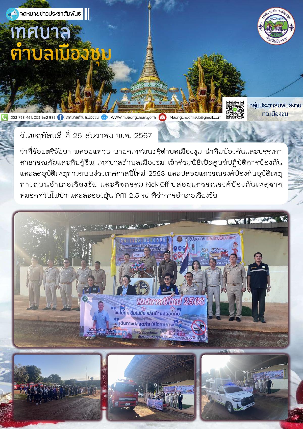 วันพฤหัสบดี ที่ 26 ธันวาคม พ.ศ. 2567 ว่าที่ร้อยตรีชัยยา พลอยแหวน นายกเทศมนตรีตำบลเมืองชุม นำทีมป้องกันและบรรเทาสาธารณภัยและทีมกู้ชีพ เทศบาลตำบลเมืองชุม เข้าร่วมพิธีเปิดศูนย์ปฏิบัติการป้องกันและลดอุบัติเหตุทางถนนช่วงเทศกาลปีใหม่ 2568 และปล่อยแถวรณรงค์ป้องกันอุบัติเหตุทางถนนอำเภอเวียงชัย และกิจกรรม Kick Off ปล่อยแถวรณรงค์ป้องกันเหตุจากหมอกควันไฟป่า และละอองฝุ่น PM 2.5 ณ ที่ว่าการอำเภอเวียงชัย