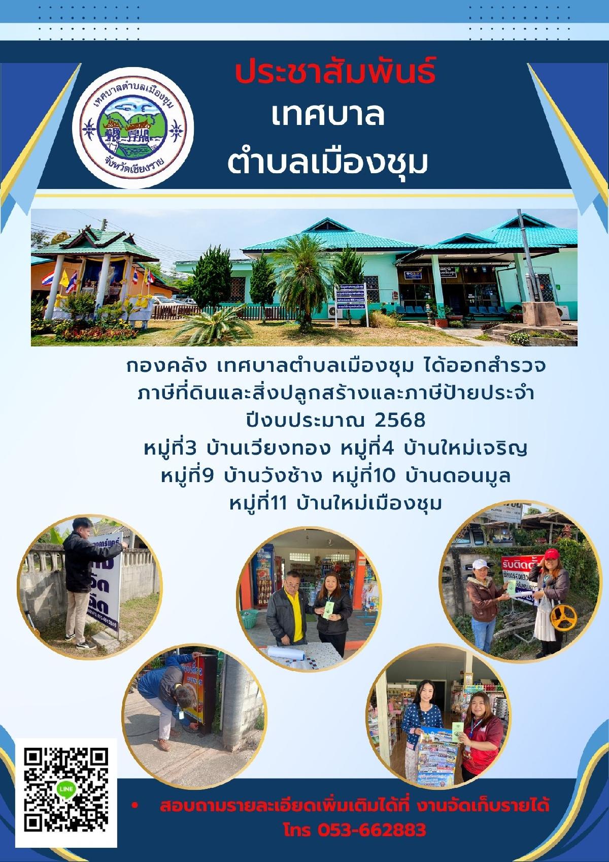 งานจัดเก็บและพัฒนารายได้ กองคลังเทศบาลตำบลเมืองชุม ได้ออกหน่วยบริการนอกสถานที่ ค่าธรรเนียมจัดเก็บขยะมูลฝอย ประจำปีงบประมาณ 2569 ณ หอประชุมหมู่ที่2 บ้านเวียงแก้ว