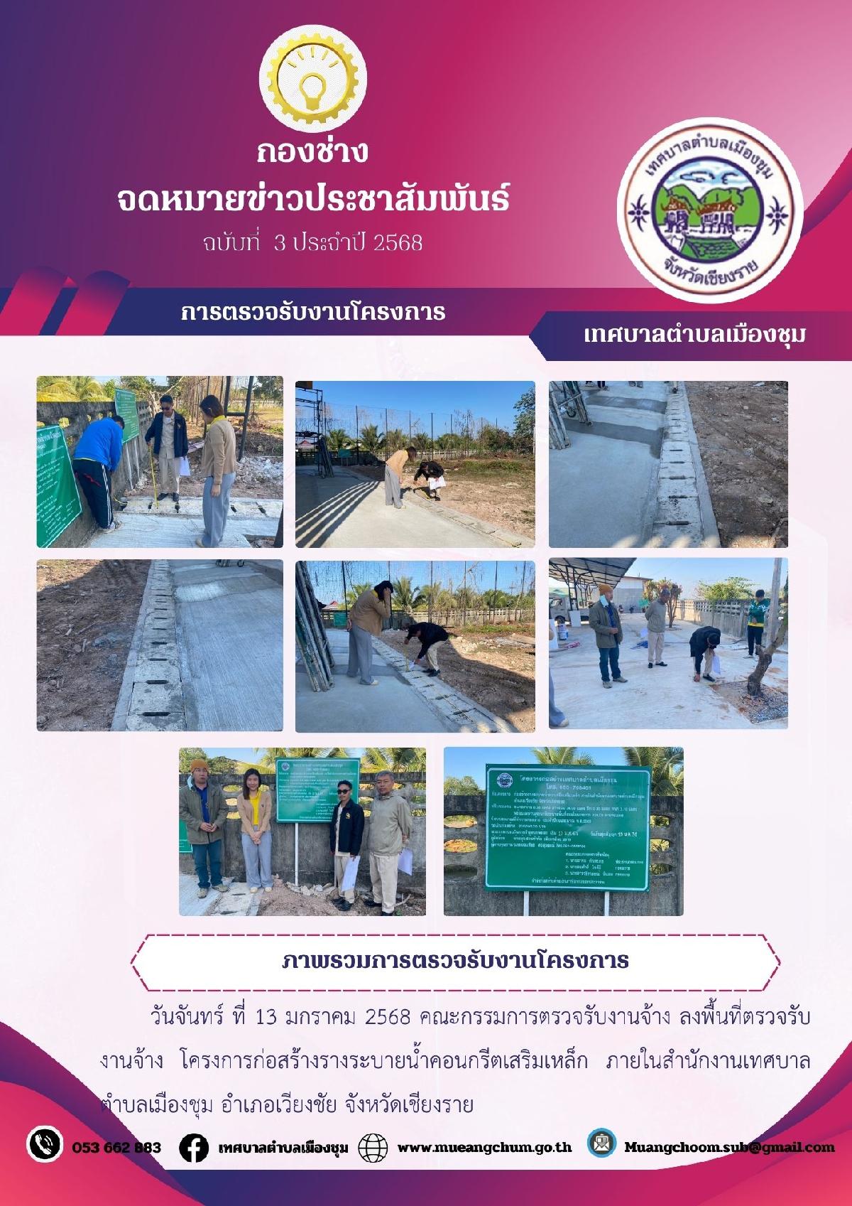 วันจันทร์ ที่ 13 มกราคม 2568 คณะกรรมการตรวจรับงานจ้าง ลงพื้นที่ตรวจรับงานจ้าง โครงการก่อสร้่างรางระบายน้ำคอนกรีตเสริมเหล็ก ภายในสำนักงานเทศบาลตำบลเมืองชุม อำเภอเวียงชัย จังหวัดเชียงราย