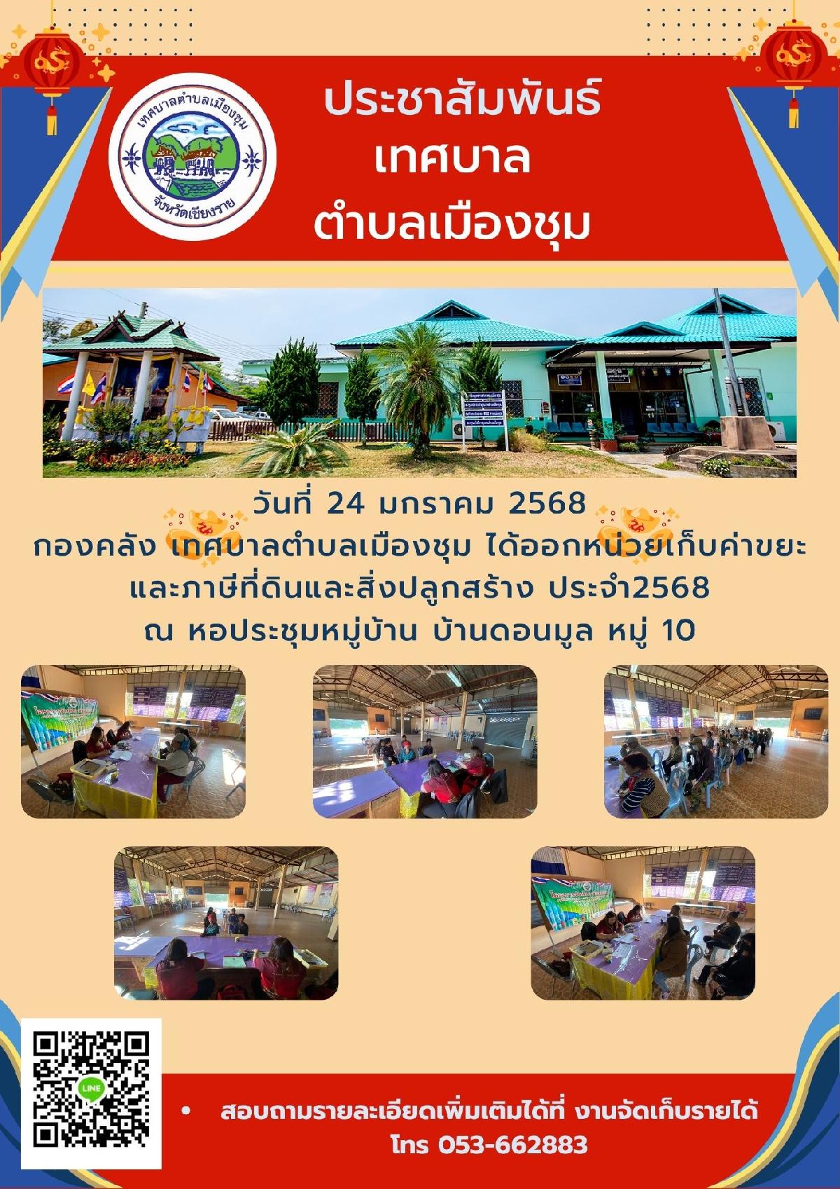 งานจัดเก็บและพัฒนารายได้ กองคลังเทศบาลตำบลเมืองชุม ได้ออกหน่วยบริการนอกสถานที่ ค่าธรรเนียมจัดเก็บขยะมูลฝอย ประจำปีงบประมาณ 2569 ณ หอประชุมหมู่ที่2 บ้านเวียงแก้ว