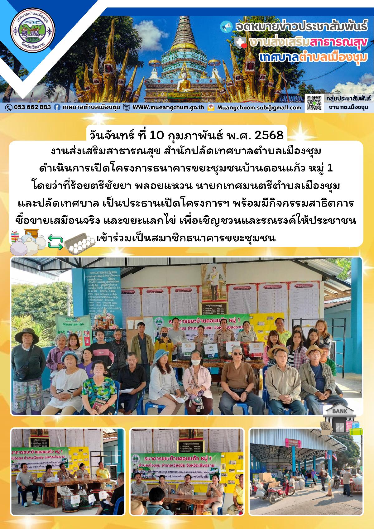 วันจันทร์ ที่ 10 กุมภาพันธ์ พ.ศ. 2568 งานส่งเสริมสาธารณสุข สำนักปลัดเทศบาลตำบลเมืองชุม ดำเนินการเปิดโครงการธนาคารขยะชุมชนบ้านดอนแก้ว หมู่ 1 โดยว่าที่ร้อยตรีชัยยา่ พลอยแหวน นายกเทศมนตรีตำบลเมืองชุม และปลัดเทศบาล เป็นประธานเปิดโครงการฯ พร้อมมีกิจกรรมสาธิตการซื้อขายเสมือนจริง และขยะแลกไข่ เพื่อเชิญชวนและรณรงค์ให้ประชาชนเข้าร่วมเป็นสมาชิกธนาคารขยะชุมชน