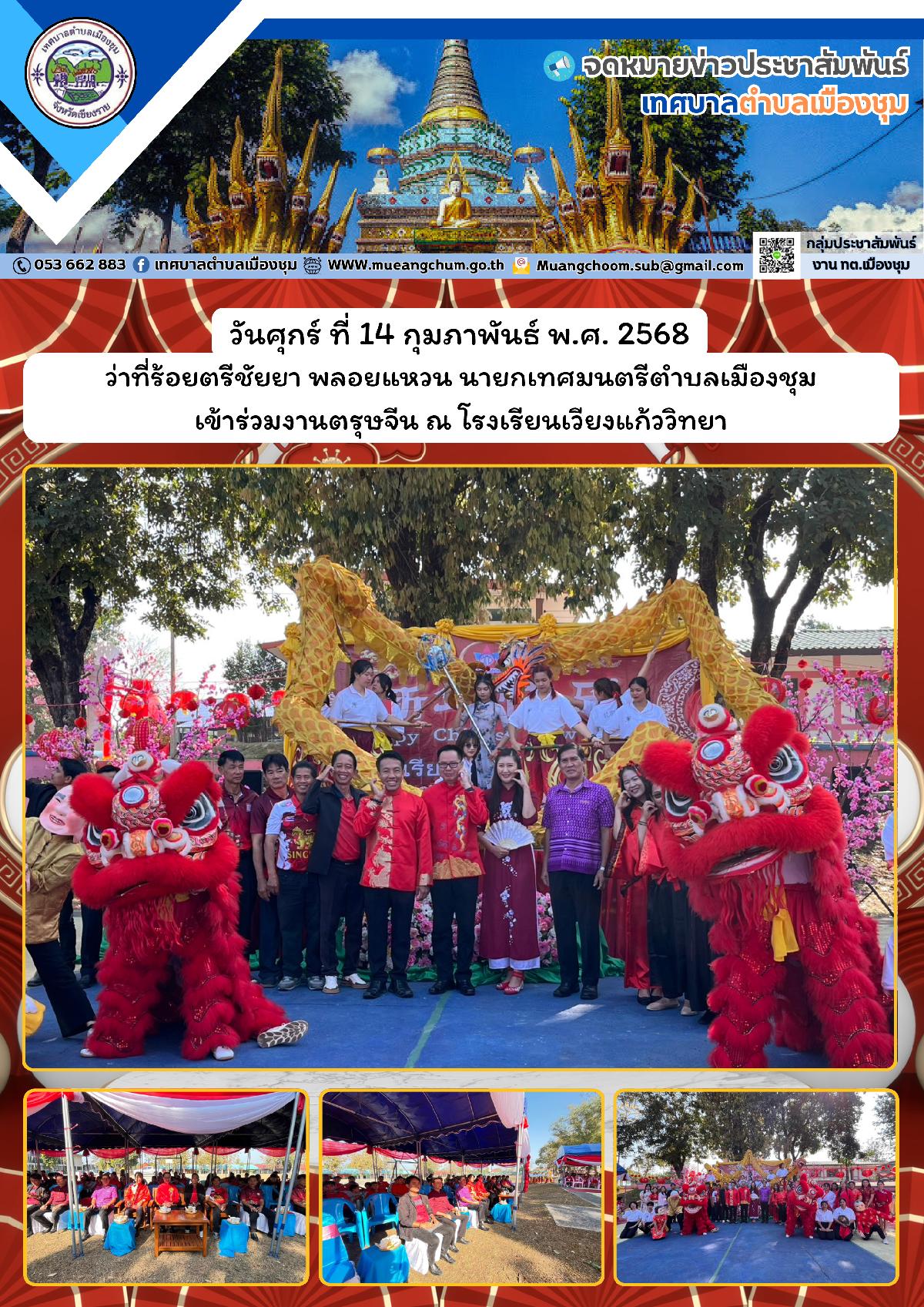 วันที่ 14 กุมภาพันธ์ พ.ศ. 2568 ว่าที่ร้อยตรีชัยยา พลอยแหวน นายกเทศมนตรีตำบลเมืองชุม เข้าร่วมงานตรุษจีน ณ โรงเรียนเวียงแก้ววิทยา
