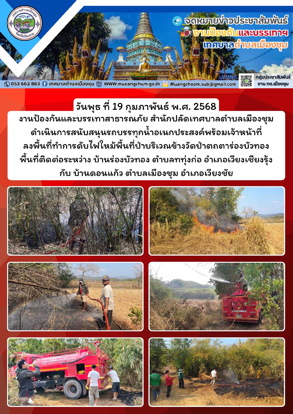 วันพุธ ที่ 19 กุมภาพันธ์ พ.ศ. 2568 งานป้องกันและบรรเทาสาธารณภัย สำนักปลัดเทศบาลตำบลเมืองชุม ดำเนินการสนับสนุนรถบรรทุกน้ำอเนกประสงค์พร้อมเจ้าหน้าที่ ลงพื้นที่ทำการดับไฟใหม้พื้นที่ป่าบริเวณข้างวัดป่าตถตาร่องบัวทอง พื้นที่ติดต่อระหว่าง บ้านร่องบัวทอง ตำบลททุ่งก่อ อำเภอเวียงเชียงรุ้ง กับ บ้านดอนแก้ว ตำบลเมืองชุม อำเภอเวียงชัย
