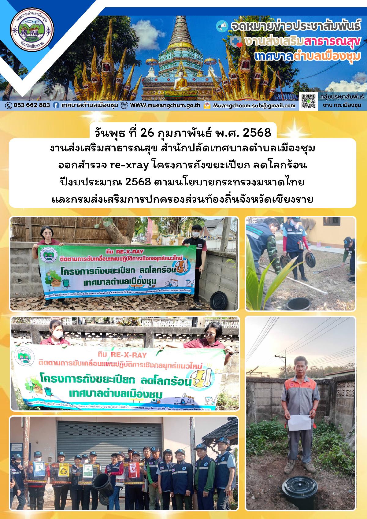 วันพุธ ที่ 26 กุมภาพันธ์ พ.ศ. 2568 งานส่งเสริมสาธารณสุข สำนักปลัดเทศบาลตำบลเมืองชุม ออกสำรวจ re-xray โครงการถังขยะเปียก ลดโลกร้อน ปีงบประมาณ 2568 ตามนโยบายกระทรวงมหาดไทยและกรมส่งเสริมการปกครองส่วนท้องถิ่นจังหวัดเชียงราย