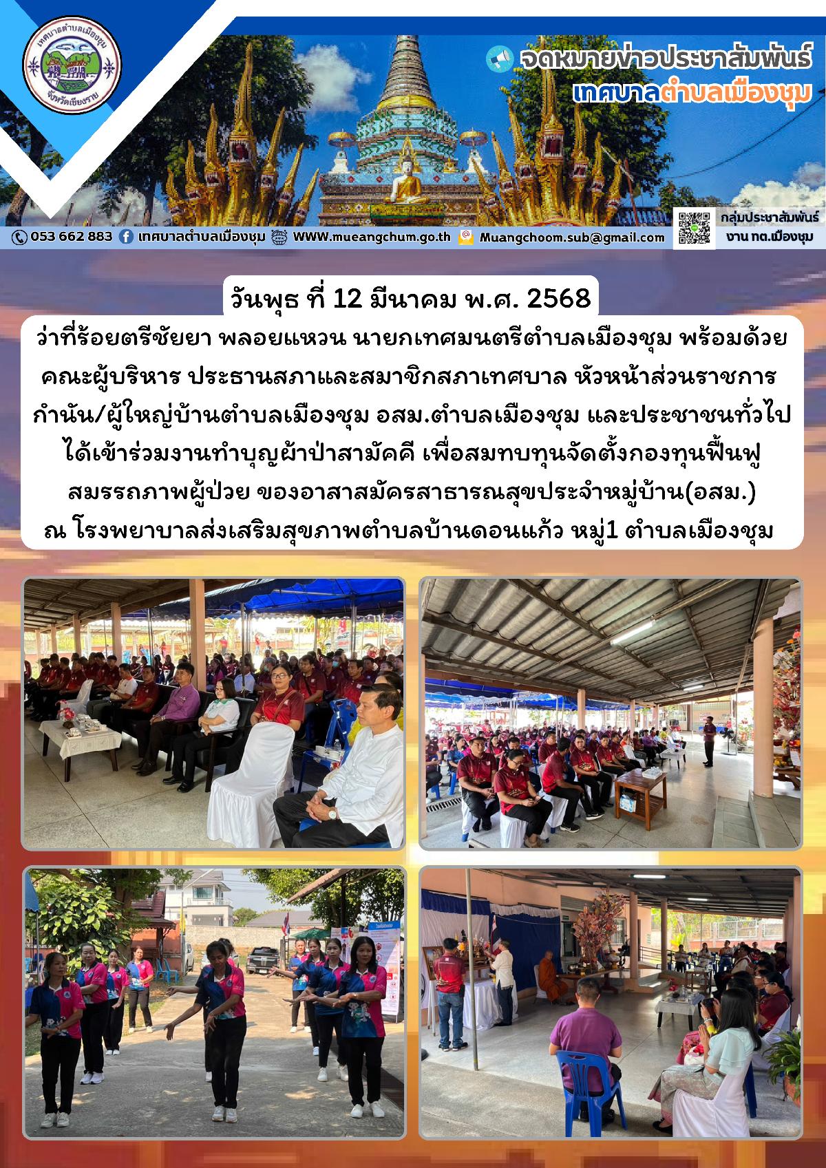 วันพุธ ที่ 12 มีนาคม พ.ศ. 2568 ว่าที่ร้อยตรีชัยยา พลอยแหวน นายกเทศมนตรีตำบลเมืองชุม พร้อมด้วยคณะผู้บริหาร ประธานสภาและสมาชิกสภาเทศบาล หัวหน้าส่วนราชการ กำนัน/ผู้ใหญ่บ้านตำบลเมืองชุม อสม.ตำบลเมืองชุม และประชาชนทั่วไป ได้เข้าร่วมงานทำบุญผ้าป่าสามัคคี เพื่อสมทบทุนจัดตั้งกองทุนฟื้นฟูสมรรถภาพผู้ป่วย ของอาสาสมัครสาธารณสุขประจำหมู่บ้าน (อสม.) ณ โรงพยาบาลส่งเสริมสุขภาพตำบลบ้านดอนแก้ว หมู่1 ตำบลเมืองชุม