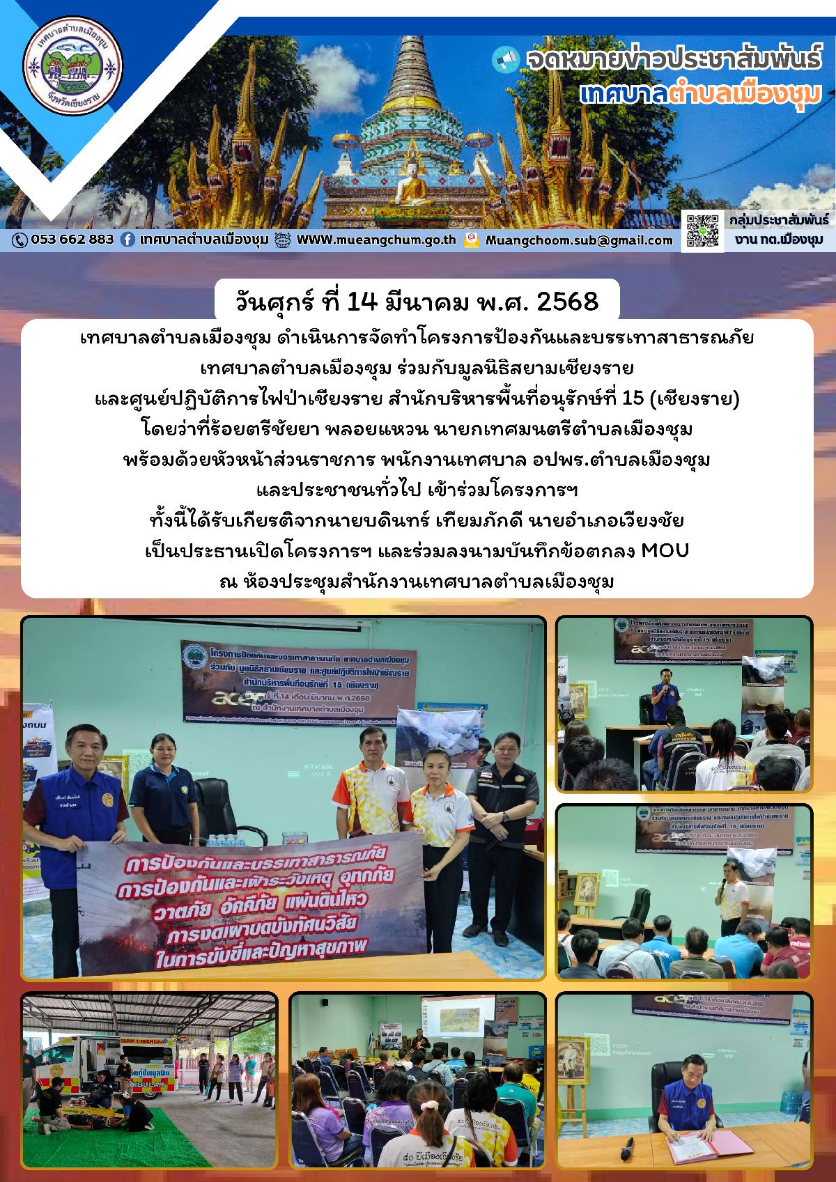 วันศุกร์ ที่ 17 มีนาคม พ.ศ. 2568 เทศบาลตำบลเมืองชุม ดำเนินการจัดทำโครงการป้องกันและบรรเทาสาธารณภัยเทศบาลตำบลเมืองชุม ร่วมกับมูลนิธิสยามเชียงราย และศูนย์ปฏิบัติการไฟป่าเชียงราย สำนักบริหารพื้นที่อนุรักษ์ที่ 15 (เชียงราย) โดยว่าที่ร้อยตรีชัยยา พลอยแหวน นายกเทศมนตรีตำบลเมืองชุม พร้อมด้วยหัวหน้าส่วนราชการ พนักงานเทศบาล อปพร.ตำบลเมืองชุม และประชาชนทั่วไป เข้าร่วมโครงการฯ ทั้งนี้ได้รับเกียรติจากนายบดินทร์ เทียมภักดี นายอำเภอเวียงชัย เป็นประธานเปิดโครงการฯ และร่วมลงนามบันทึกข้อตกลง MOU ณ ห้องประชุมสำนักงานเทศบาลตำบลเมืองชุม