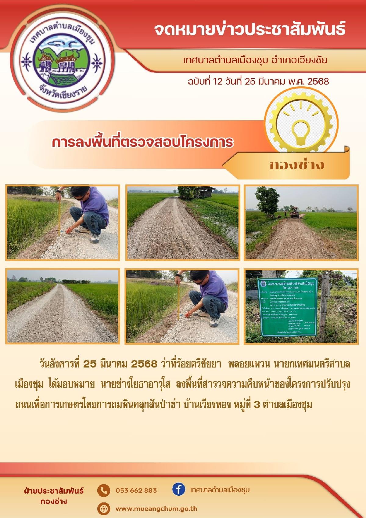 วันอังคารที่ 25 มีนาคม 2568 ว่าที่ร้อยตรีชัยยา พลอยแหวน นายกเทศมนตรีตำบลเมืองชุมได้มอบหมาย นายช่างโยธาอาวุโส ลงพื้นที่สำรวจความคืบหน้าของโครงการปรับปรุงถนนเพื่อการเกษตรโดยการถมหินคลุกสันป่าข่า บ้านเวียงทอง หมู่ที่ 3 ตำบลเมืองชุม