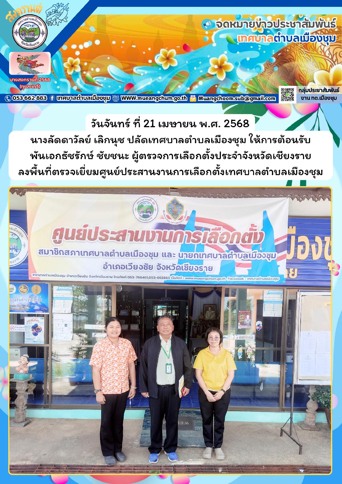 วันจันทร์ ที่ 21 เมษายน พ.ศ. 2568 นางลัดดาวัลย์ เลิกนุช ปลัดเทศบาลตำบลเมืองชุม ให้การต้อนรับ พันเอกธัชรักษ์ ชัยชนะ ผู้ตรวจการเลือกตั้งประจำจังหวัดเชียงราย ลงพื้นที่ตรวจเยี่ยมศูนย์ประสานงานการเลือกตั้งเทศบาลตำบลเมืองชุม
