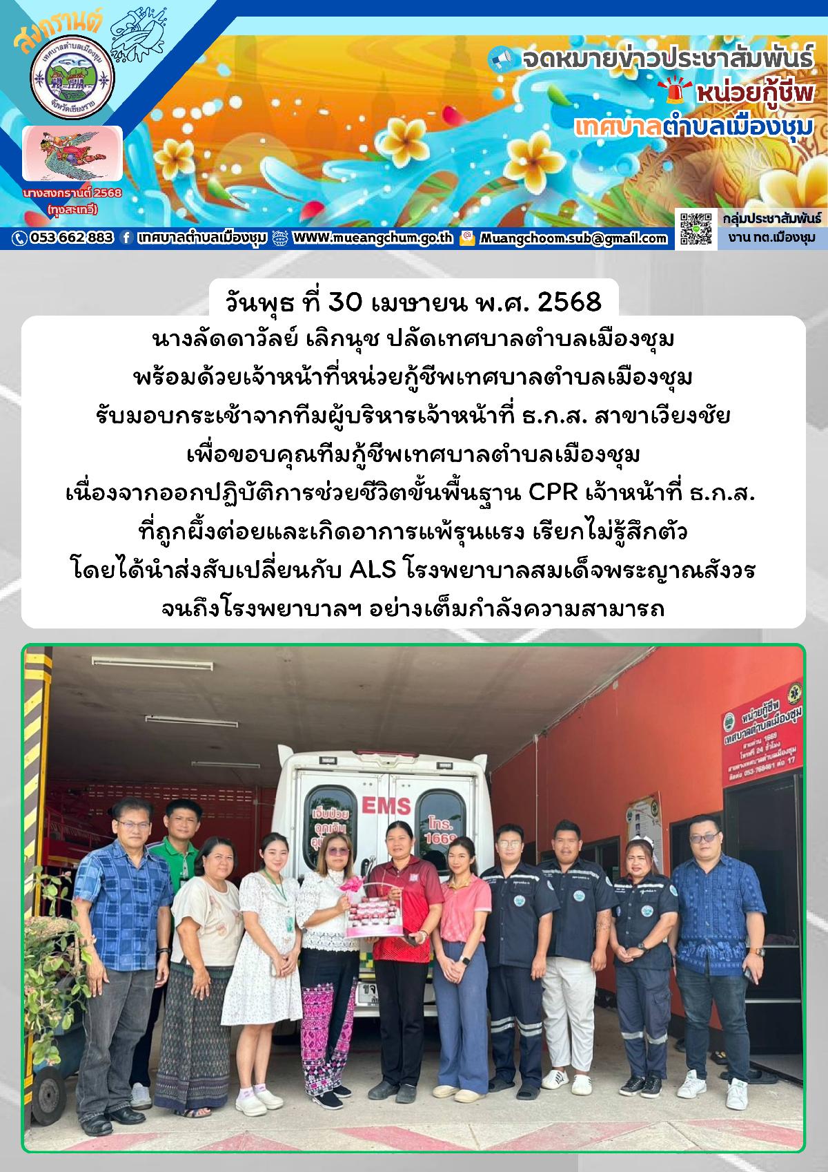 วันพุธ ที่ 30 เมษายน พ.ศ. 2568 นางลัดดาวัลย์ เลิกนุช ปลัดเทศบาลตำบลเมืองชุม พร้อมด้วยเจ้าหน้าที่หน่วยกู้ชีพเทศบาลตำบลเมืองชุม รับมอบกระเช้าจากทีมผู้บริหารเจ้าหน้าที่ ธ.ก.ส. สาขาเวียงชัย เพื่อขอบคุณทีมกู้ชีพเทศบาลตำบลเมืองชุม เนื่องจากออกปฏิบัติการช่วยชีวิตขั้นพื้นฐาน CPR เจ้าหน้าที่ ธ.ก.ส. ที่ถูกผึ้งต่อยและเกิดอาการแพ้รุนแรง เรียกไม่รู้สึกตัว โดยได้นำส่งสับเปลี่ยนกับ ALS โรงพยาบาลสมเด็จพระญาณสังวร จนถึงโรงพยาบาลฯ อย่างเต็มกำลังความสามารถ