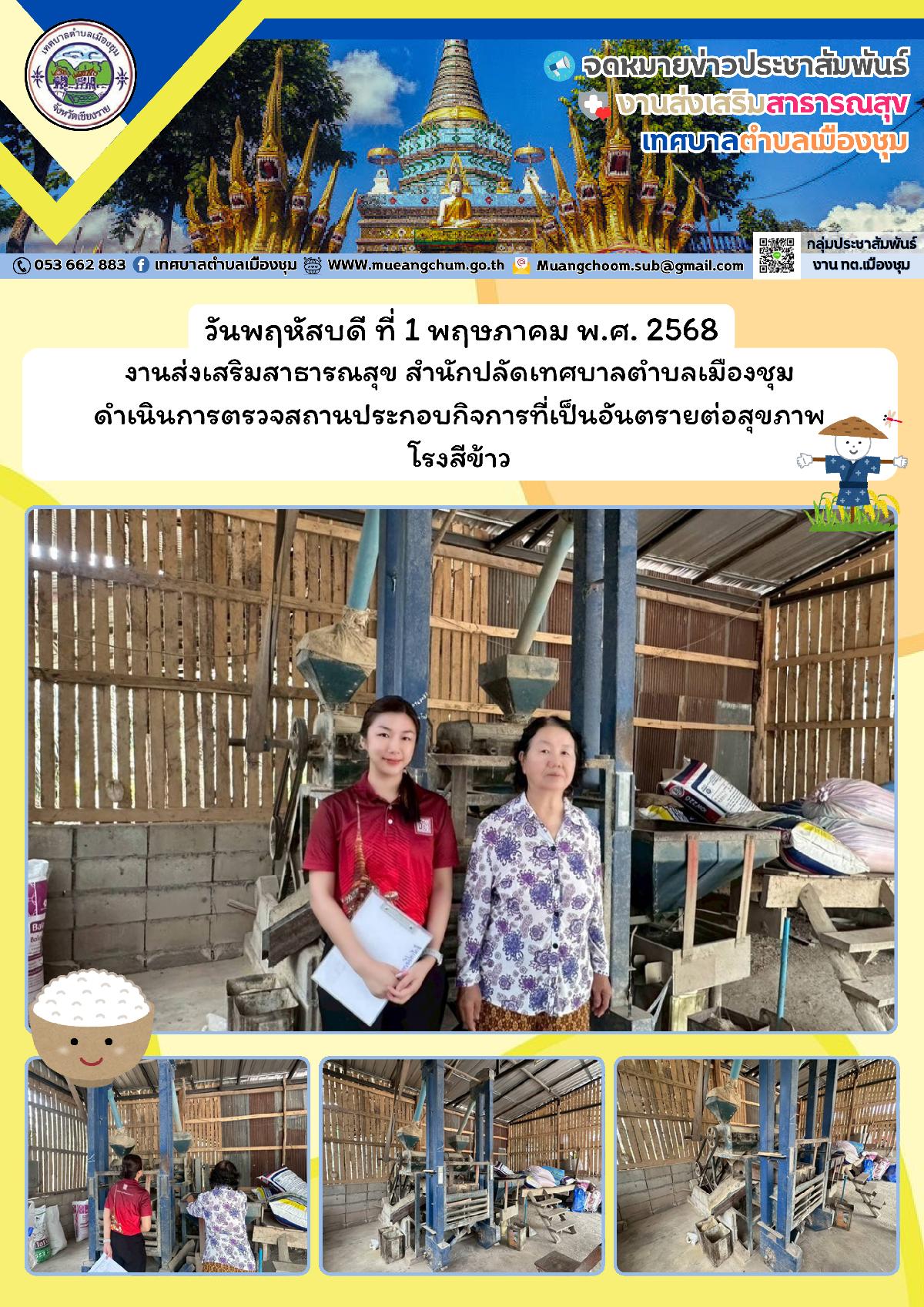 วันพฤหัสบดี ที่ 1 พฤษภาคม พ.ศ. 2568 งานส่งเสริมสาธารณสุข สำนักปลัดเทศบาลตำบลเมืองชุม ดำเนินการตรวจสถานประกอบกิจการที่เป็นอันตรายต่อสุขภาพ โรงสีข้าว