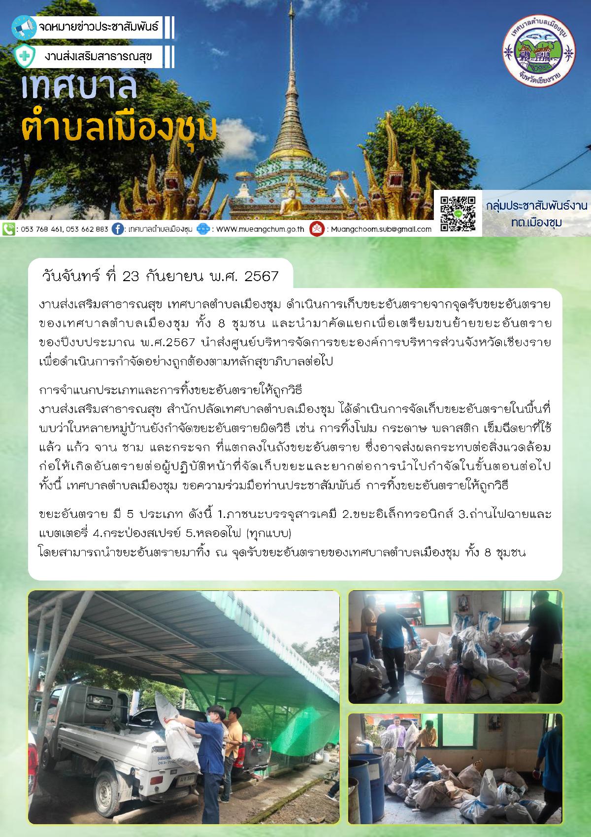 วันจันทร์ ที่ 23 กันยายน พ.ศ. 2567 งานส่งเสริมสาธารณสุข เทศบาลตำบลเมืองชุม ดำเนินการเก็บขยะอันตรายจากจุดรับขยะอันตรายของเทศบาลตำบลเมืองชุม ทั้ง 8 ชุมชน และนำมาคัดแยกเพื่อเตรียมขนย้ายขยะอันตรายของปีงบประมาณ พ.ศ.2567 นำส่งศูนย์บริหารจัดการขยะองค์การบริหารส่วนจังหวัดเชียงราย เพื่อดำเนินการกำจัดอย่างถูกต้องตามหลักสุขาภิบาลต่อไป