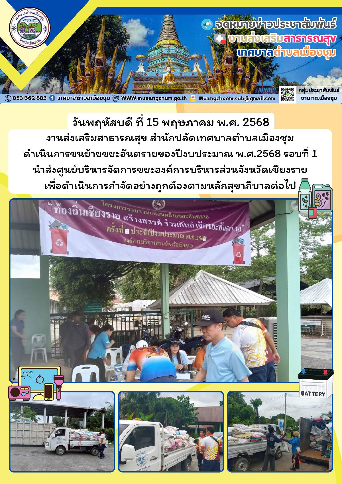 วันพฤหัสบดี ที่ 15 พฤษภาคม พ.ศ. 2568 งานส่งเสริมสาธารณสุข สำนักปลัดเทศบาลตำบลเมืองชุม ดำเนินการขนย้ายขยะอันตรายของปีงบประมาณ พ.ศ.2568 รอบที่ 1 นำส่งศูนย์บริหารจัดการขยะองค์การบริหารส่วนจังหวัดเชียงราย เพื่อดำเนินการกำจัดอย่างถูกต้องตามหลักสุขาภิบาลต่อไป