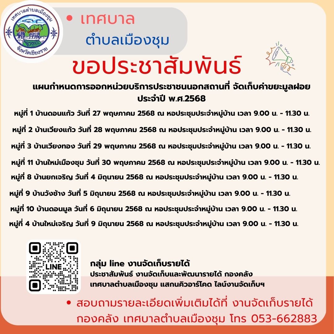งานจัดเก็บและพัฒนารายได้ กองคลังเทศบาลตำบลเมืองชุม ได้ออกหน่วยบริการนอกสถานที่ ค่าธรรเนียมจัดเก็บขยะมูลฝอย ประจำปีงบประมาณ 2569 ณ หอประชุมหมู่ที่2 บ้านเวียงแก้ว