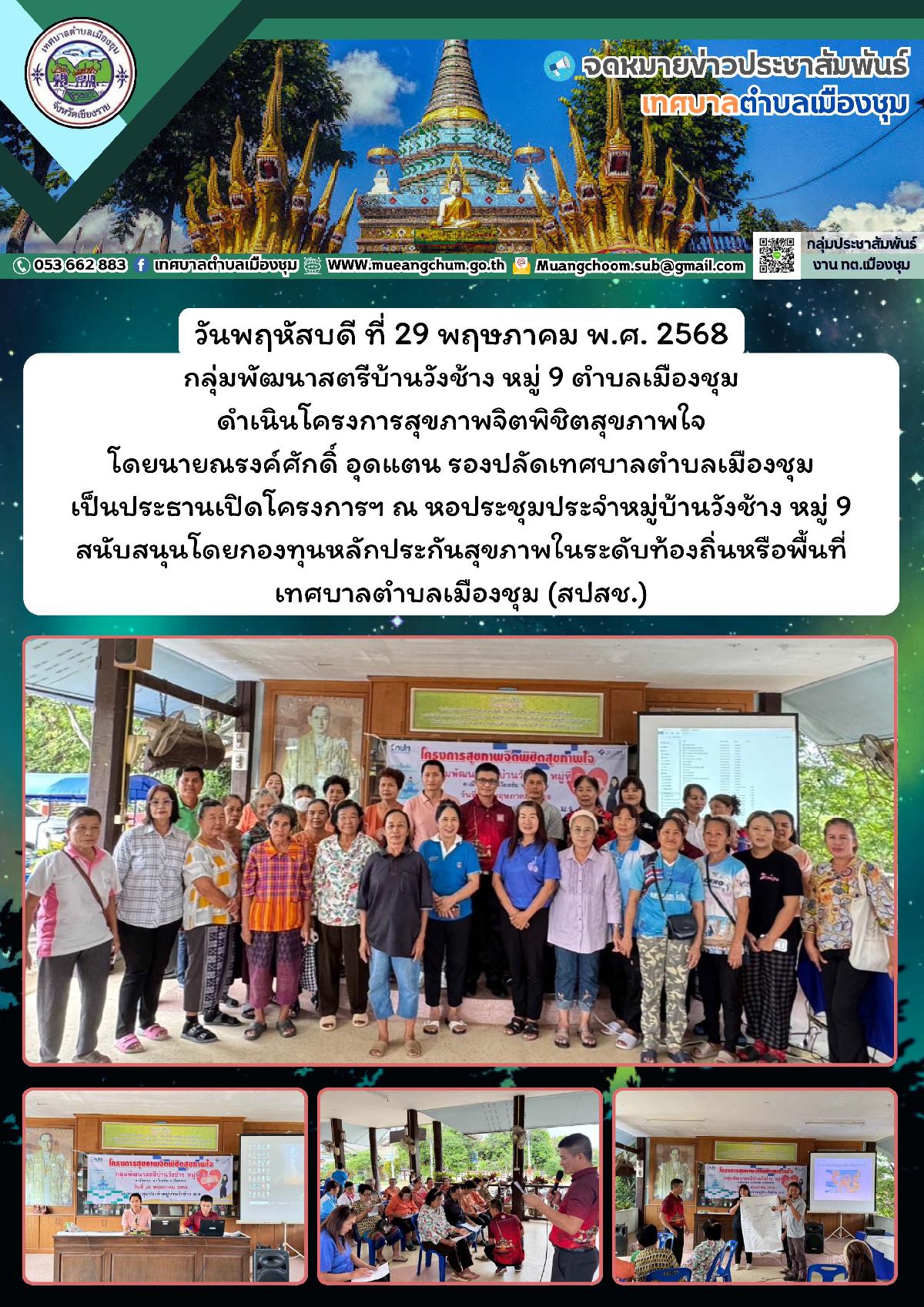 โครงการอบรมเรื่องควบคุม ป้องกัน และเฝ้าระวังไข้เลือดออก ดำเนินโครงการฯ โดย กลุ่ม อสม.ตำบลเมืองชุม สนับสนุนโดยกองทุนหลักประกันสุขภาพในระดับท้องถิ่นหรือพื้นที่เทศบาลตำบลเมืองชุม (สปสช.)