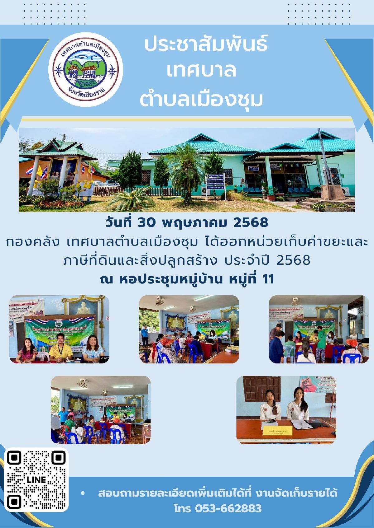 งานจัดเก็บและพัฒนารายได้ กองคลังเทศบาลตำบลเมืองชุม ได้ออกหน่วยบริการนอกสถานที่ ค่าธรรเนียมจัดเก็บขยะมูลฝอย ประจำปีงบประมาณ 2569 ณ หอประชุมหมู่ที่2 บ้านเวียงแก้ว