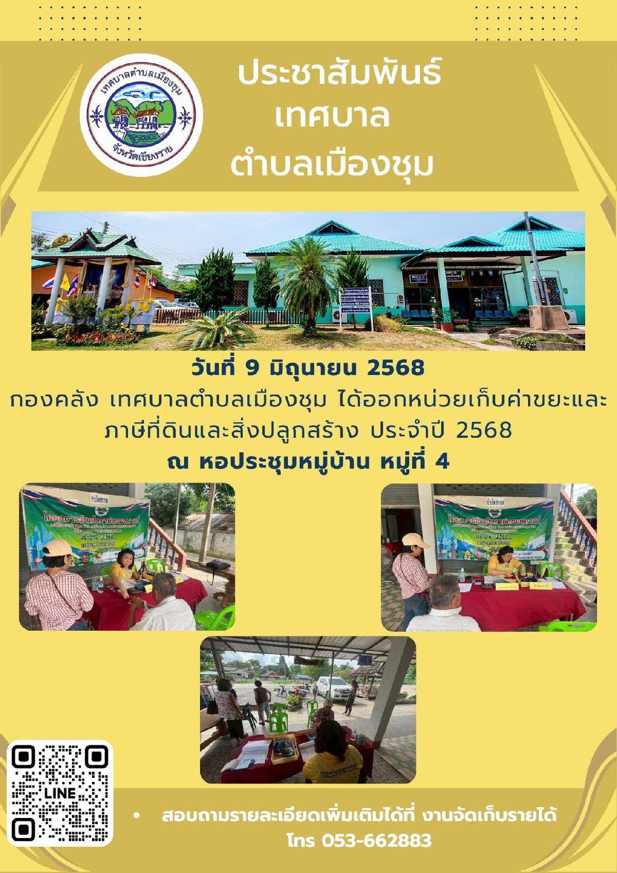 งานจัดเก็บและพัฒนารายได้ กองคลังเทศบาลตำบลเมืองชุม ได้ออกหน่วยบริการนอกสถานที่ ค่าธรรเนียมจัดเก็บขยะมูลฝอย ประจำปีงบประมาณ 2569 ณ หอประชุมหมู่ที่2 บ้านเวียงแก้ว