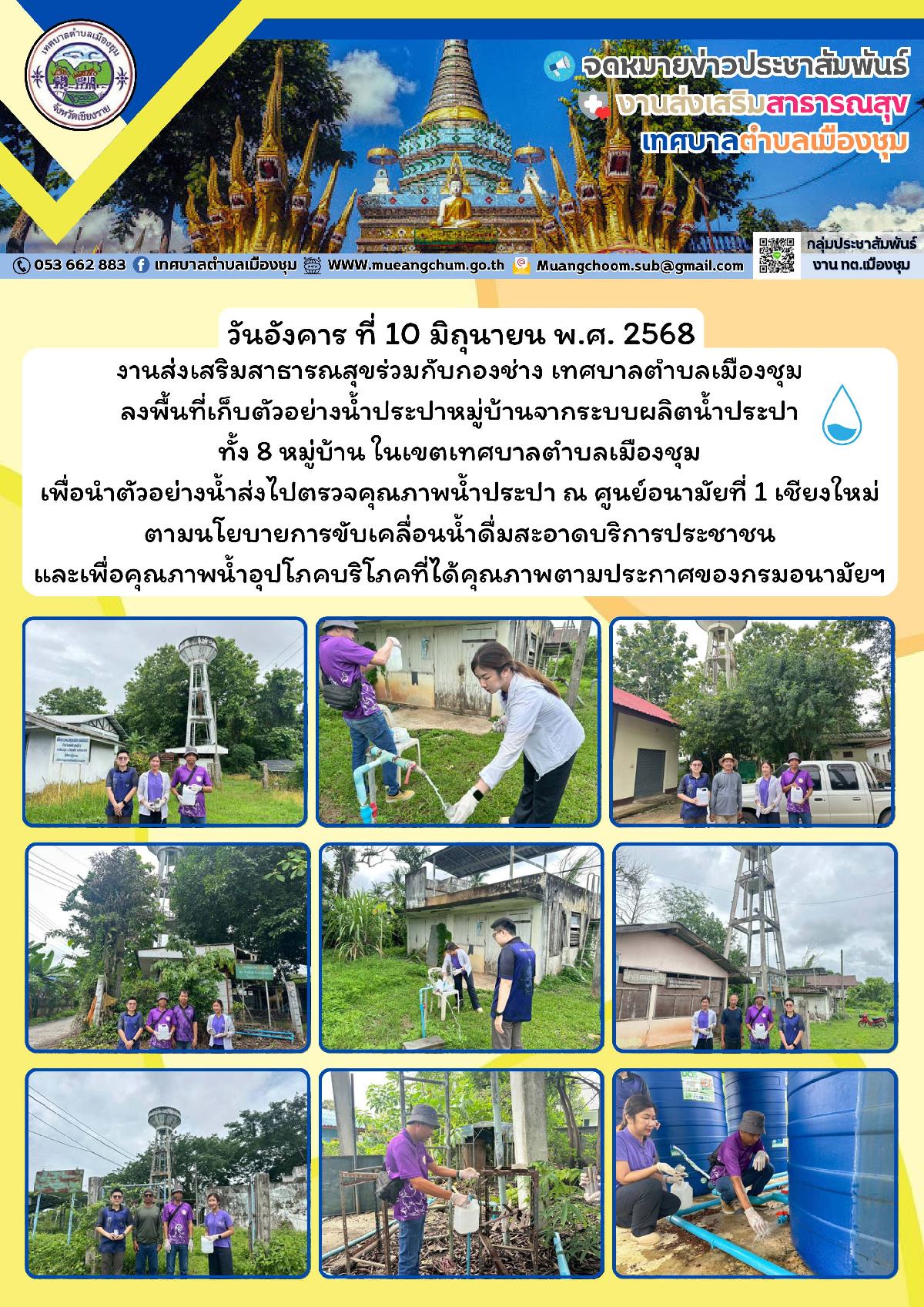 วันอังคาร ที่ 10 มิถุนายน พ.ศ. 2568 งานส่งเสริมสาธารณสุขร่วมกับกองช่าง เทศบาลตำบลเมืองชุม ลงพื้นที่เก็บตัวอย่างน้ำประปาหมู่บ้านจากระบบผลิตน้ำประปาทั้ง 8 หมู่บ้าน ในเขตเทศบาลตำบลเมืองชุม เพื่อนำตัวอย่างน้ำส่งไปตรวจคุณภาพน้ำประปา ณ ศูนย์อนามัยที่ 1 เชียงใหม่ ตามนโยบายการขับเคลื่อนน้ำดื่มสะอาดบริการประชาชนและเพื่อคุณภาพน้ำอุปโภคบริโภคที่ได้คุณภาพตามประกาศของกรมอนามัยฯ