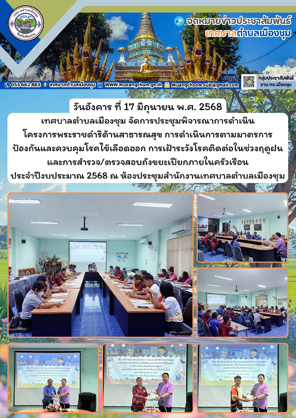 วันอังคาร ที่ 17 มิถุนายน พ.ศ. 2568 เทศบาลตำบลเมืองชุม จัดการประชุมพิจารณาการดำเนินโครงการพระราชดำริด้านสาธารณสุข การดำเนินการตามมาตรการป้องกันและควบคุมโรคไข้เลือดออก การเฝ้าระวังโรคติดต่อในช่วงฤดูฝน และการสำรวจ/ตรวจสอบถังขยะเปียกภายในครัวเรือน ประจำปีงบประมาณ 2568 ณ ห้องประชุมสำนักงานเทศบาลตำบลเมืองชุม