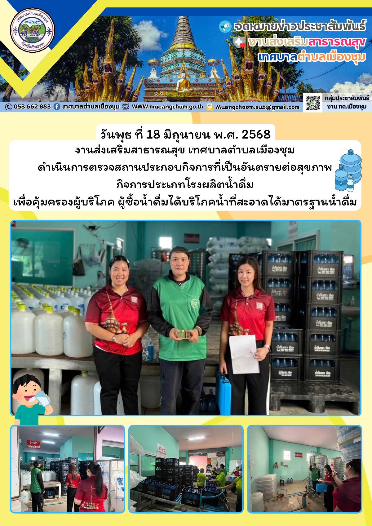 วันพุธ ที่ 18 มิถุนายน พ.ศ. 2568 งานส่งเสริมสาธารณสุข เทศบาลตำบลเมืองชุม ดำเนินการตรวจสถานประกอบกิจการที่เป็นอันตรายต่อสุขภาพ กิจการประเภทโรงผลิตน้ำดื่ม เพื่อคุ้มครองผู้บริโภค ผู้ซื้อน้ำดื่มได้บริโภคน้ำที่สะอาดได้มาตรฐานน้ำดื่ม