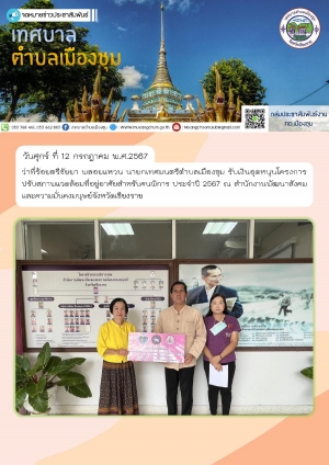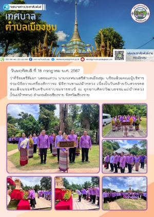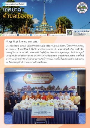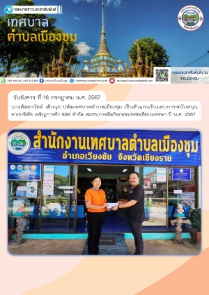 นางลัดดาวัลย์ เลิกนุช ปลัดเทศบาลตำบลเมืองชุม เป็นตัวแทนรับมอบการสนับสนุนจากบริษัท เจริญการค้า 888 จำกัด สมทบการจัดกิจกรรมหล่อเทียนพรรษา ปี พ.ศ. 2567