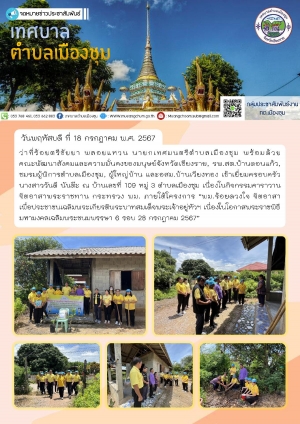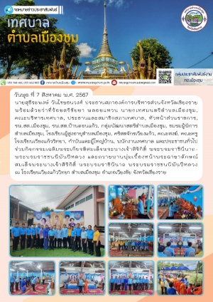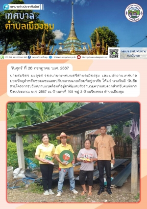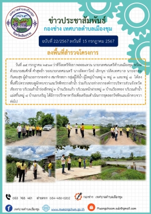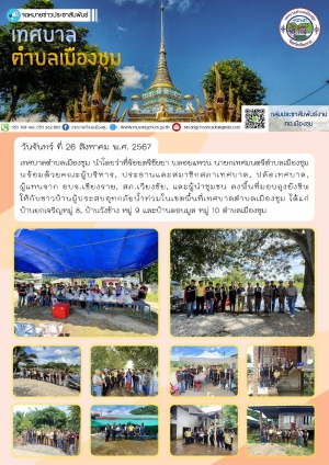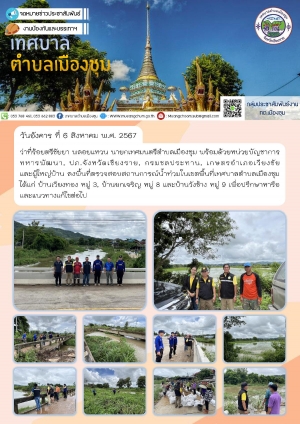 ลงพื้นที่มอบถุงยังชีพให้กับชาวบ้านผู้ประสบอุทกภัยน้ำท่วมในพื้นที่เขตเทศบาลตำบลเมืองชุม ณ บ้านวังช้าง หมู่ 9 ตำบลเมืองชุม และตรวจสอบวัชพืชบริเวณสะพานข้ามลำน้ำแม่สะกึ๋น บ้านเวียงทอง หมู่ 3 ตำบลเมืองชุม