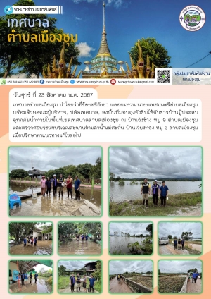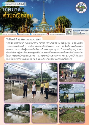 ลงพื้นที่ตรวจสอบสถานการณ์น้ำท่วมในเขตพื้นที่เทศบาลตำบลเมืองชุม ได้แก่ บ้านเวียงทอง หมู่ 3, บ้านยกเจริญ หมู่ 8 และบ้านวังช้าง หมู่ 9 เพื่อปรึกษาหารือและแนวทางแก้ไขต่อไป