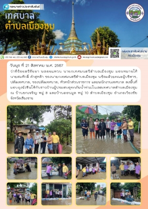 ลงพื้นที่มอบถุงยังชีพให้กับชาวบ้านผู้ประสบอุทกภัยน้ำท่วมในเขตเทศบาลตำบลเมืองชุม ณ บ้านยกเจริญ หมู่ 8 บ้านวังช้าง หมู่ 9 และบ้านดอนมูล หมู่ 10 ตำบลเมืองชุม