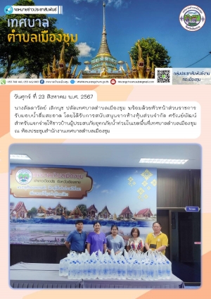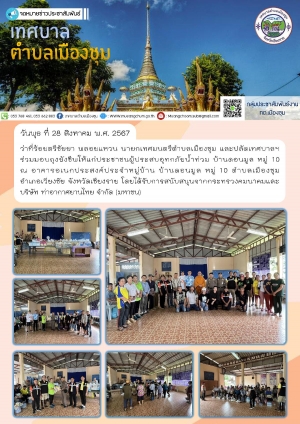 รับมอบน้ำดื่มสะอาด สำหรับแจกจ่ายให้ชาวบ้านผู้ประสบภัยอุทกภัยน้ำท่วมในเขตพื้นที่เทศบาลตำบลเมืองชุม ณ ห้องประชุมสำนักงานเทศบาลตำบลเมืองชุม