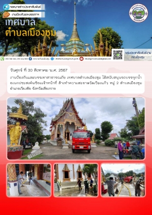 งานป้องกันและบรรเทาสาธารณภัย เทศบาลตำบลเมืองชุม ได้สนับสนุนรถบรรทุกน้ำอเนกประสงค์พร้อมเจ้าหน้าที่ ล้างทำความสะอาดวัดเวียงแก้ว หมู่ 2