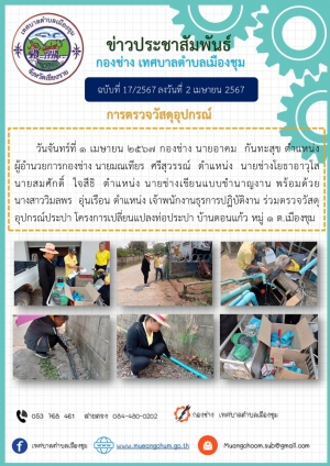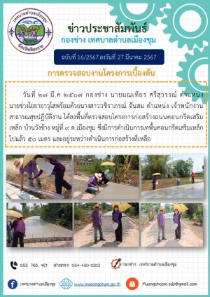 การตรวจสอบงานโครงการเบื้องต้น วันพุธที่ 27 มีนาคม 2567 กองช่าง นายมณเทียร ศรีสุวรรณ์ ตำแหน่ง นายช่างโยธาอาวุโสพร้อมด้วยนางสาววชิราภรณ์ จันสม ตำแหน่ง เจ้าพนักงานสาธารณสุขปฏิบัติงาน ได้ลงพื้นที่ตรวจสอบ