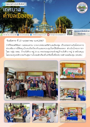 โครงการส่งเสริมการใช้สมุนไพรเพื่อป้องกันและควบคุมโรคไข้เลือดออก ดำเนินโครงการฯ โดย กลุ่ม อสม. บ้านวังช้าง หมู่ 9 สนับสนุนโดยกองทุนหลักประกันสุขภาพในระดับท้องถิ่นหรือพื้นที่เทศบาลตำบลเมืองชุม (สปสช.)