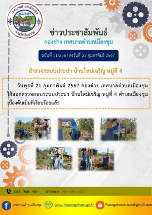 กองช่าง เทศบาลตำบลเมืองชุม ได้ออกตรวจสอบระบบประปา บ้านใหม่เจริญ หมู่ที่ 4 ตำบลเมืองชุม เบื้องต้นเป็นที่เรียบร้อยแล้ว