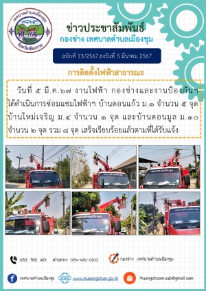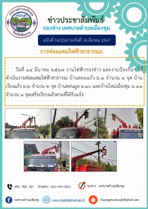 วันที่ 26 มี.ค 67 งานไฟฟ้ากองช่าง และงานป้องกันฯ ได้ดำเนินงานซ่อมไฟฟ้าสาธารณ บ้านดอนแก้ว ม.1 จำนวน 2 จุด บ้านวังช้าง ม.9 จำนวน 2 จุด บ้านดอนมูล ม.10 จำนวน 1 จุด และบ้านใหม่เมืองชุม ม.11 จำนวน 1จุด เสร