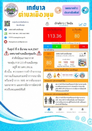 วันศุกร์ ที่ 8 มีนาคม พ.ศ.2567 เทศบาลตำบลเมืองชุมแจ้ง ค่าดัชนีคุณภาพอากาศ ของฝุ่น P.M 2.5 ตำบลเมืองชุม อยู่ที่ 80 มคก./ลบ.ม.