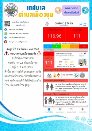 วันศุกร์ ที่ 15 มีนาคม พ.ศ.2567 เทศบาลตำบลเมืองชุมแจ้ง ค่าดัชนีคุณภาพอากาศ ของฝุ่น P.M 2.5 ตำบลเมืองชุม อยู่ที่ 111 มคก./ลบ.ม.