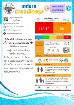 วันจันทร์ ที่ 18 มีนาคม พ.ศ.2567 เทศบาลตำบลเมืองชุมแจ้ง ค่าดัชนีคุณภาพอากาศ ของฝุ่น P.M 2.5 ตำบลเมืองชุม อยู่ที่ 86 มคก./ลบ.ม.