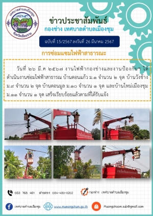 งานไฟฟ้ากองช่าง และงานป้องกันฯ ได้ดำเนินงานซ่อมแซมไฟฟ้าสาธารณะ ม.1, ม.3, ม.9, ม.11