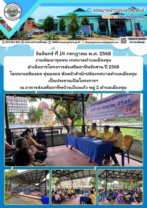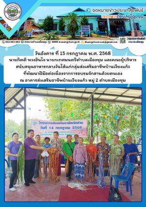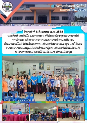 นายกิตติ พวงอินใจ นายกเทศมนตรีตำบลเมืองชุม และคณะผู้บริหาร สนับสนุนอาหารกลางวันให้แก่กลุ่มส่งเสริมอาชีพบ้านเวียงแก้ว หมู่ 2 ที่พัฒนาฝีมือต่อเนื่องจากการอบรมจักสานด้วยตนเอง